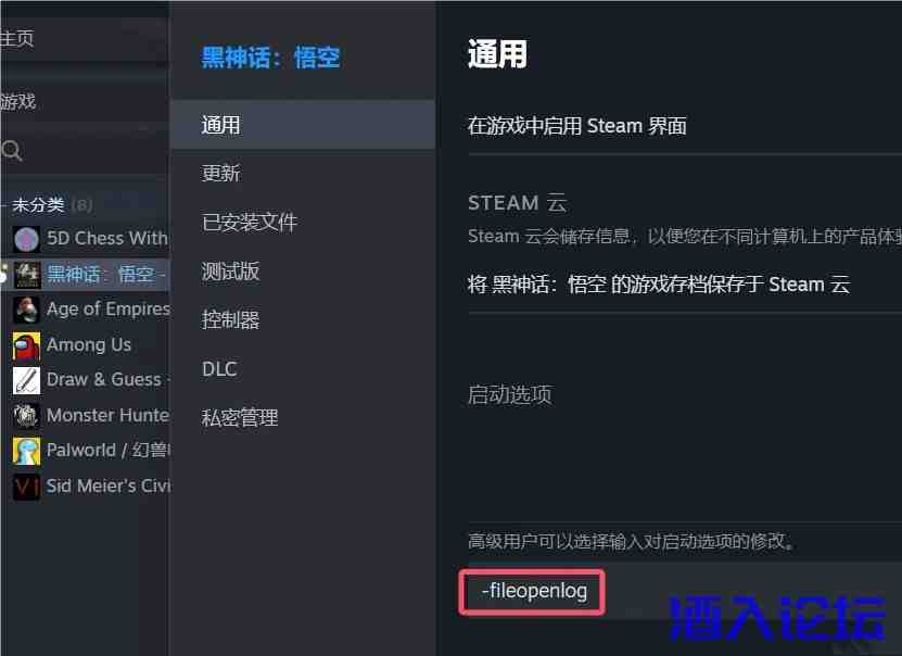 3.在steam中在游戏上右键,点属性,添加启动启动项修改 -fileopenlog (见图示)